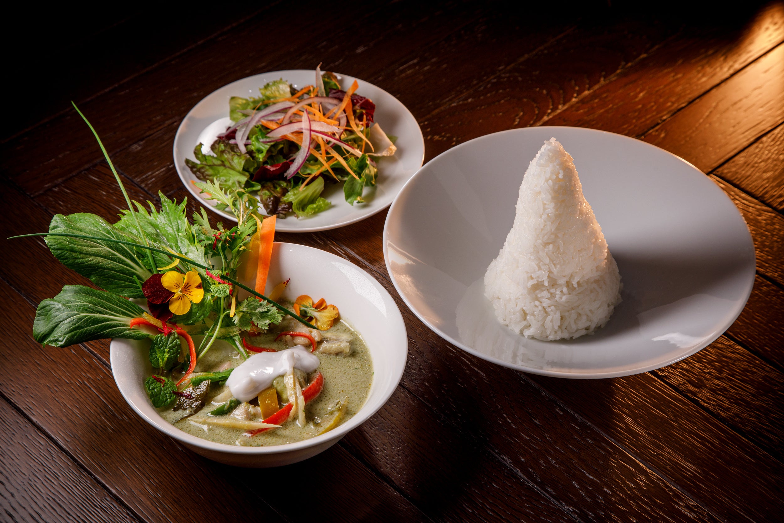 青唐辛子などのスパイスに、レモングラス・コブミカンなどのハーブをブレンド。ココナッツミルクのコクと甘味を効かせたタイの代表的カレー。彩り鮮やかな生野菜を添えて。リッチな味わいで、ジャスミンライスとの相性もばっちりです。