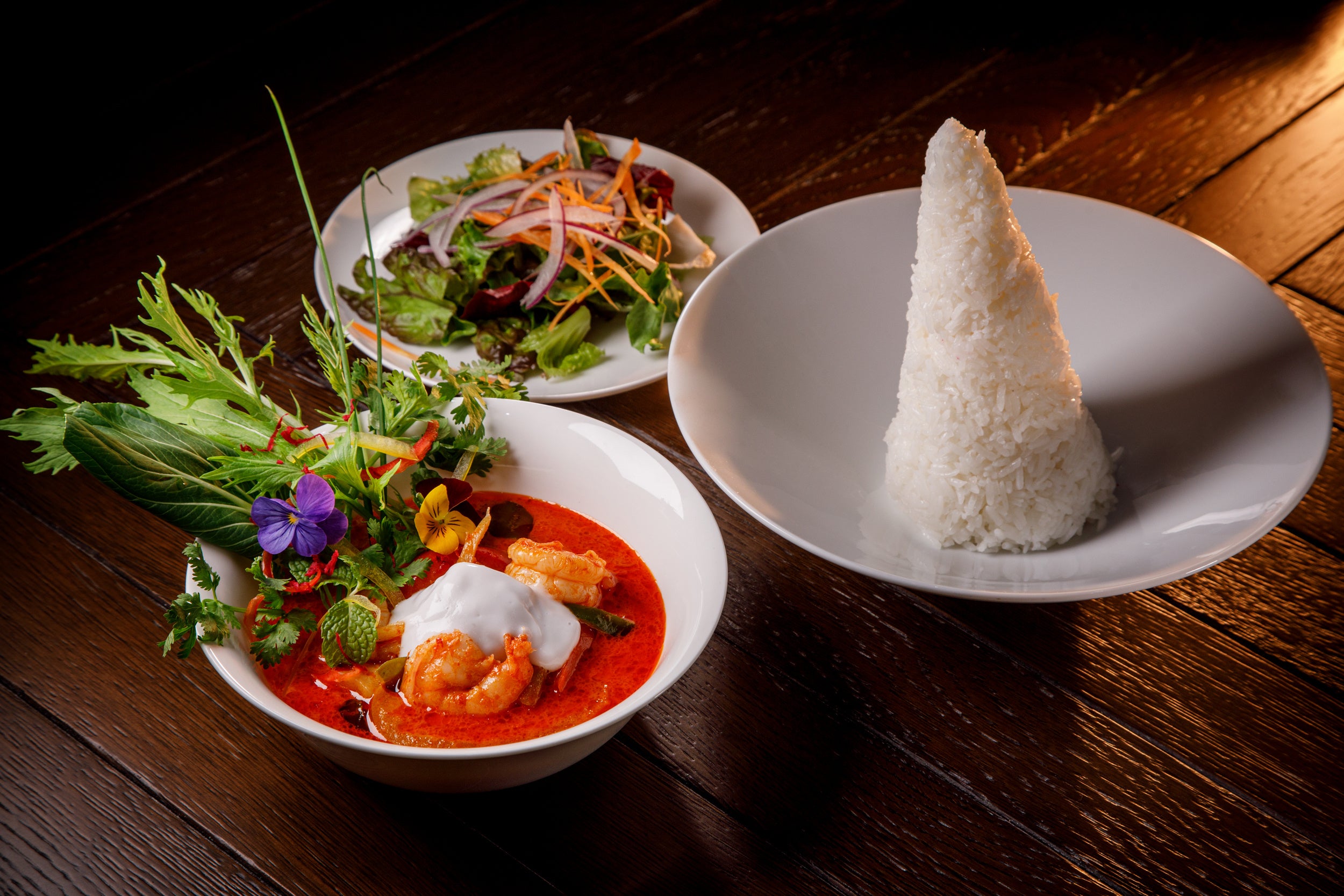 数種の赤唐辛子などのスパイスに、レモングラス・コブミカンなどのハーブをブレンド。ココナッツミルクの甘味の中に辛みが極立つタイカレー。彩り鮮やかな生野菜を添えて。リッチな味わいで、ジャスミンライスとの相性もばっちりです。