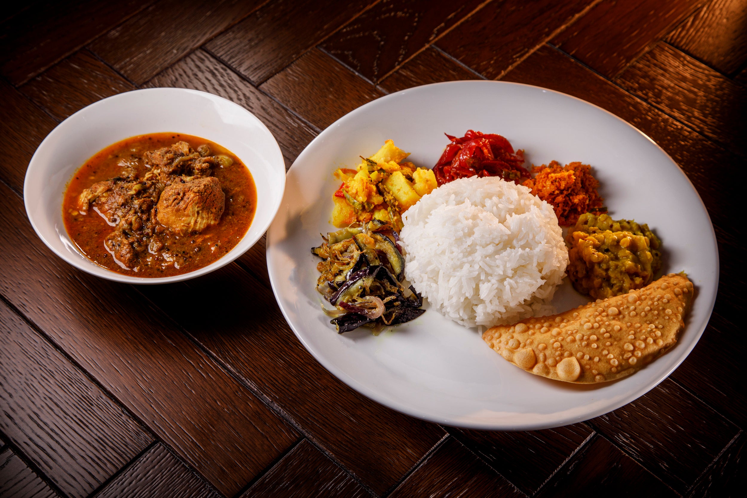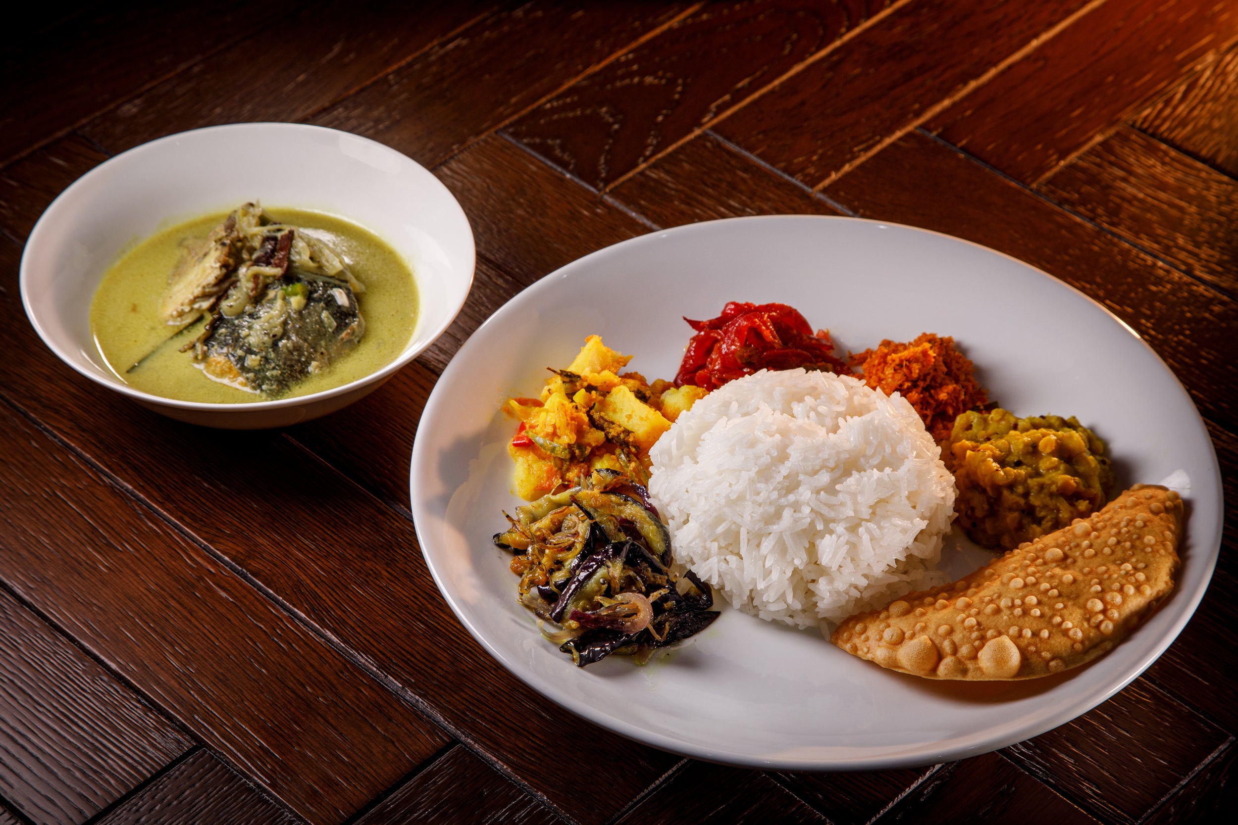 島国スリランカらしい魚を使ったカレー、ココナッツミルクのクリーミーさにコラカ(酸味料)を加えた独特の味わい。ナスのモージュ(和え物)・デビルドポテト(じゃがいものドライカレー)・シーニサンボール(タマネギの和え物)・ポルサンボール(ココナッツのふりかけ)パリップ(豆カレー)・パパダン(豆のせんべい)をお皿の手前で少しずつ混ぜて楽しんでください!