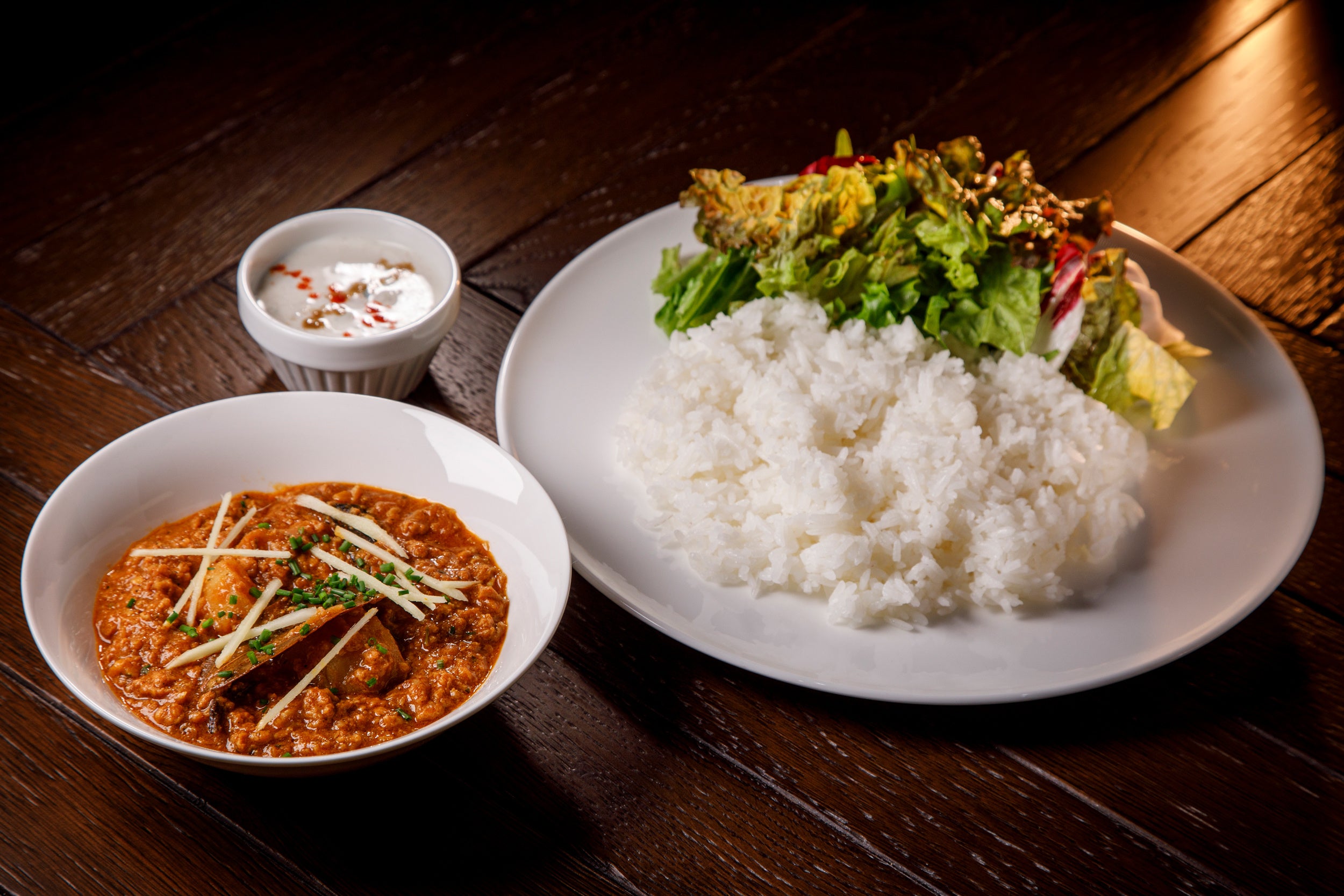 ホロホロになるまで炒め煮したマトンとトマトの旨味を凝縮させた癖になる味。付け合わせのライタ(ヨーグルトサラダ)で味変も楽しめます。