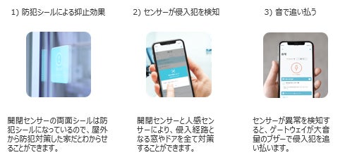 「Secual サービス」は設置工事不要、利用者ご自身で簡単に取り付けが可能な、月額980円(税込1,078円)から始められるセルフ型のホームセキュリティサービスです。個人宅向けの「Secualホームセキュリティ」、スマートタウン向け統合サービス「NiSUMU」、賃貸住宅向けサービス「NiSUMU RENT」の3つのサービスをご用意し、さまざまな住環境の安全・安心をサポートしています。申込からご利用中もスマートフォンで簡単に操作でき、自宅の安全をいつでもスマートフォンから操作・確認いただけます。また、防犯対策として重要な以下3つのポイントを押さえ、機能に活かしています。