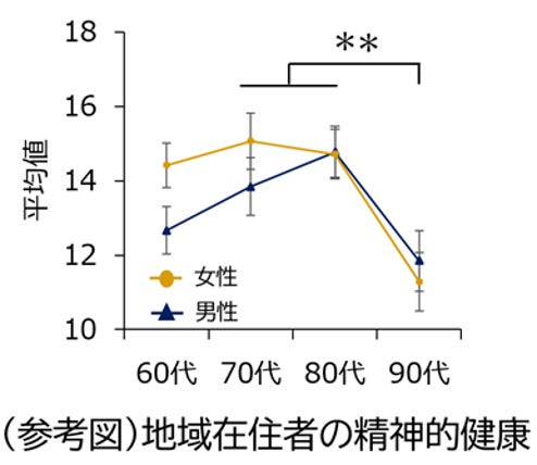 ①精神的健康状態を表すスコアは性別に関わらず、年代が上がるごとに高く、90代の方のスコアが70~80代の方よりも統計的に有意に高い(図1)。単純比較はできないものの、地域在住のご高齢者を対象にした2023年の調査注1では90代の方のスコアが低いという結果となっていた(参考図)。