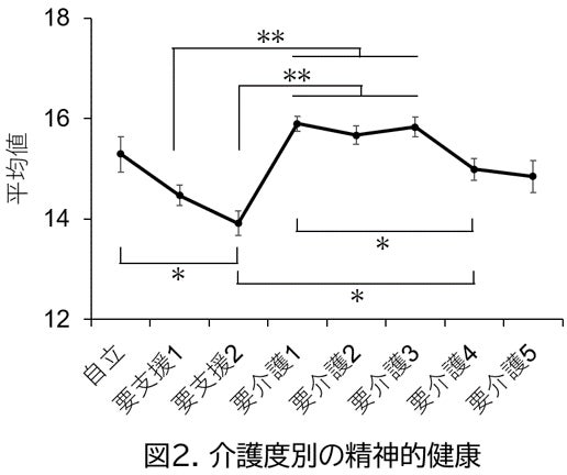 ③介護度が要支援2の方よりも自立、要介護1、2、3、4の方の精神的健康状態を表すスコアが統計的に有意に高い(図2)。