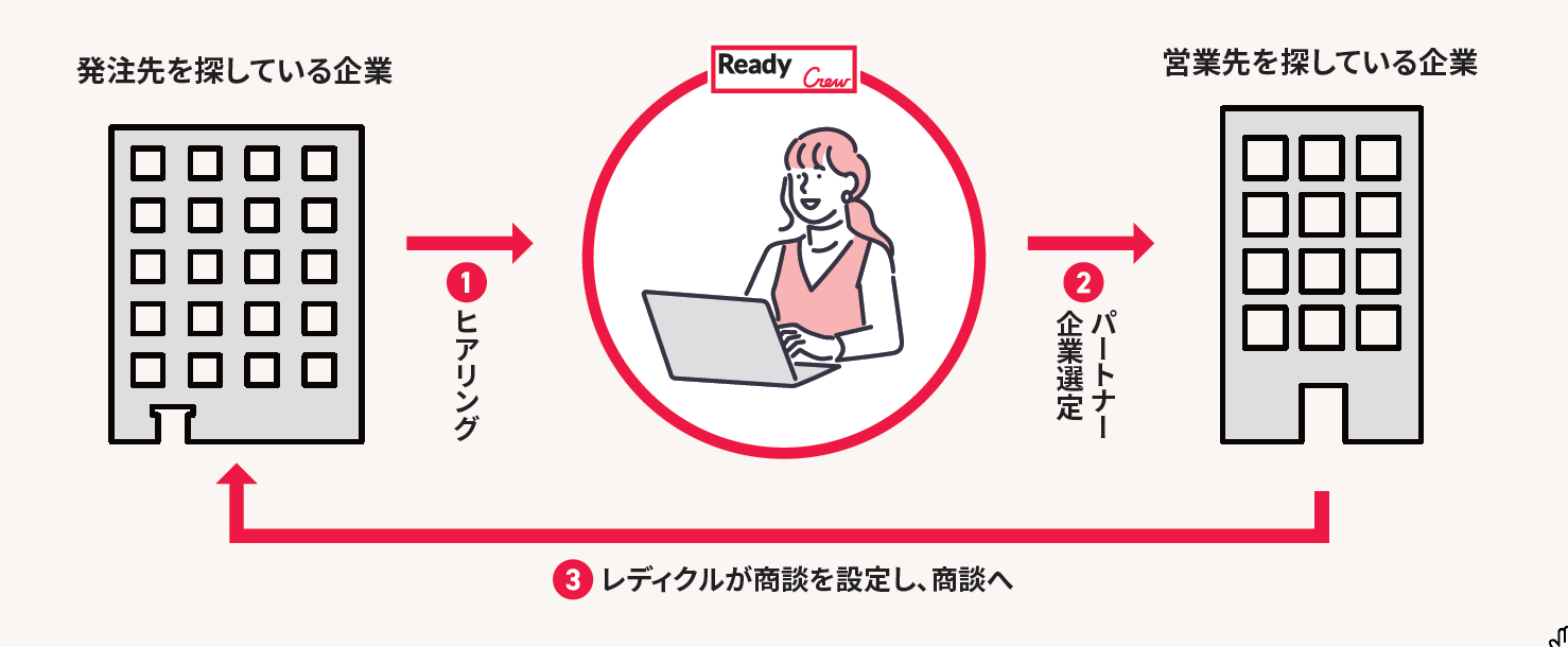 ビジネスマッチングエージェント「Ready Crew(レディクル)」は、お客様の発注をコンシェルジュが仲介する無料のサービスです。