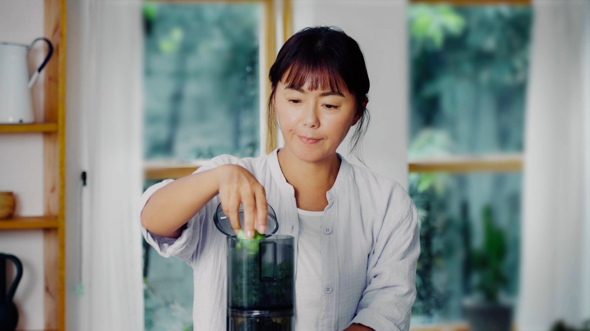両手でギュッと搾るように、あらゆる食材の水分と栄養素をしっかりと抽出します。 新鮮な野菜や果物をそのまま食べているような、シルキーな食感と濃厚で深い味わいのジュースが作れます。