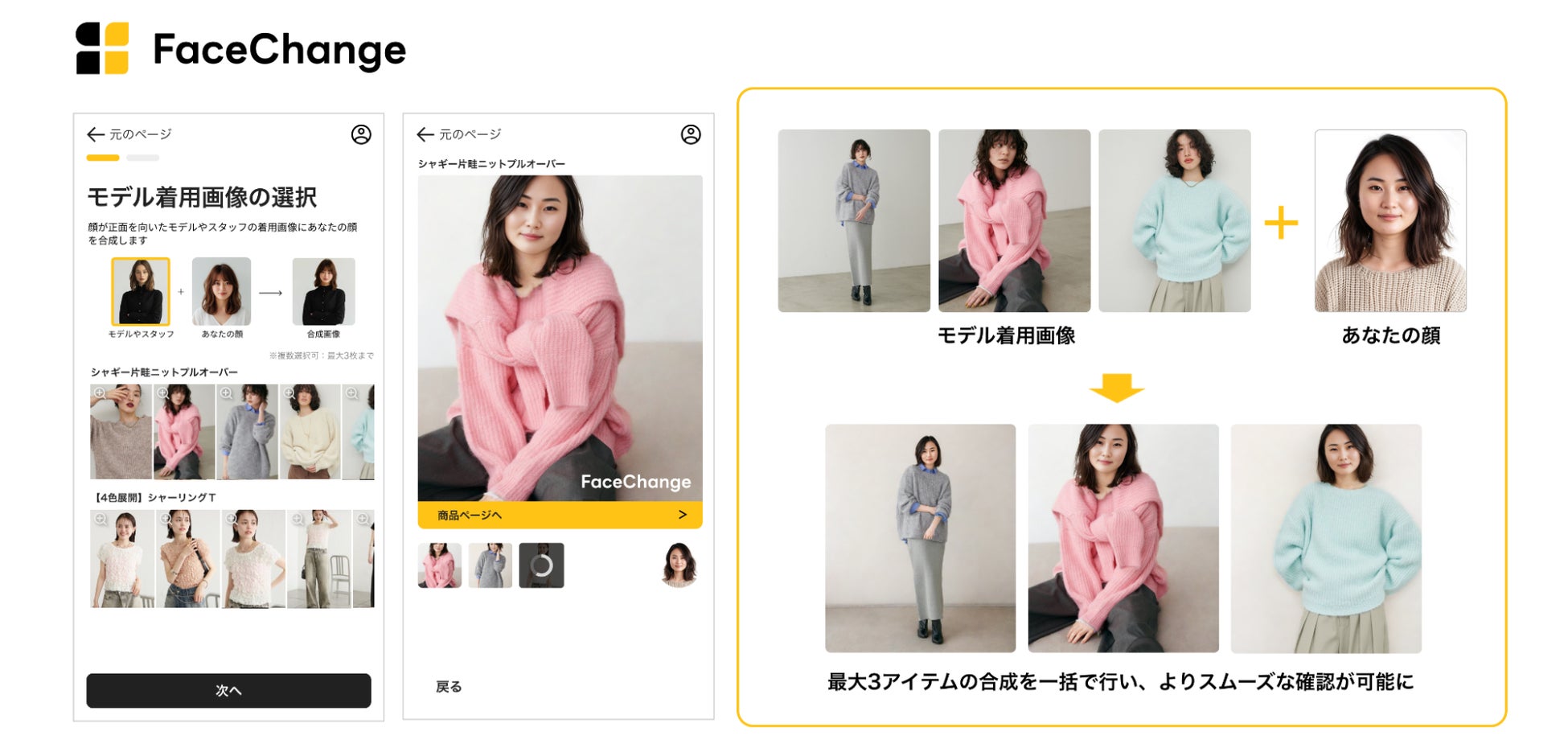 FaceChangeは、ECサイト上のモデルやスタッフの着用画像とユーザーの顔写真を合成し、自分の顔を合わせた着用イメージを可視化できるサービスです。(特許申請中)