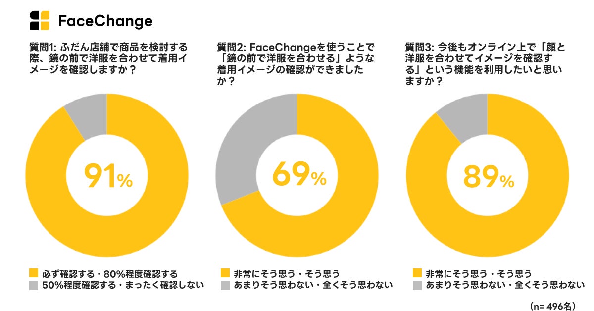 また、ECサイト上で「顔と洋服を合わせてイメージを確認したい」と答えた人もおよそ9割にのぼり、このことから、オンラインで洋服を選ぶ際にも“自分に似合っているかを視覚的に確認したい”というニーズが非常に高いことが伺えます。