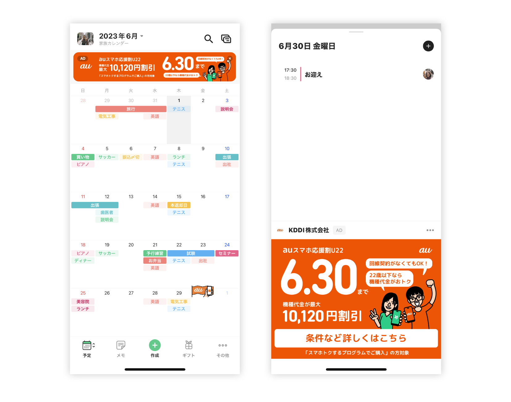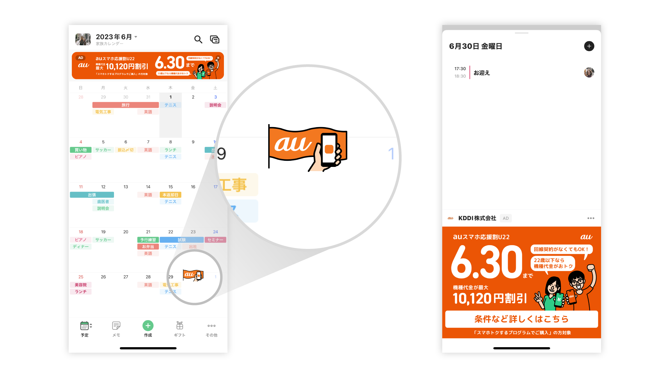 リニューアルしたTimeTree Ads ターゲットデイを活用して、2023年6月よりKDDI株式会社様「auスマホ応援割U22」キャンペーン広告を掲載しました。