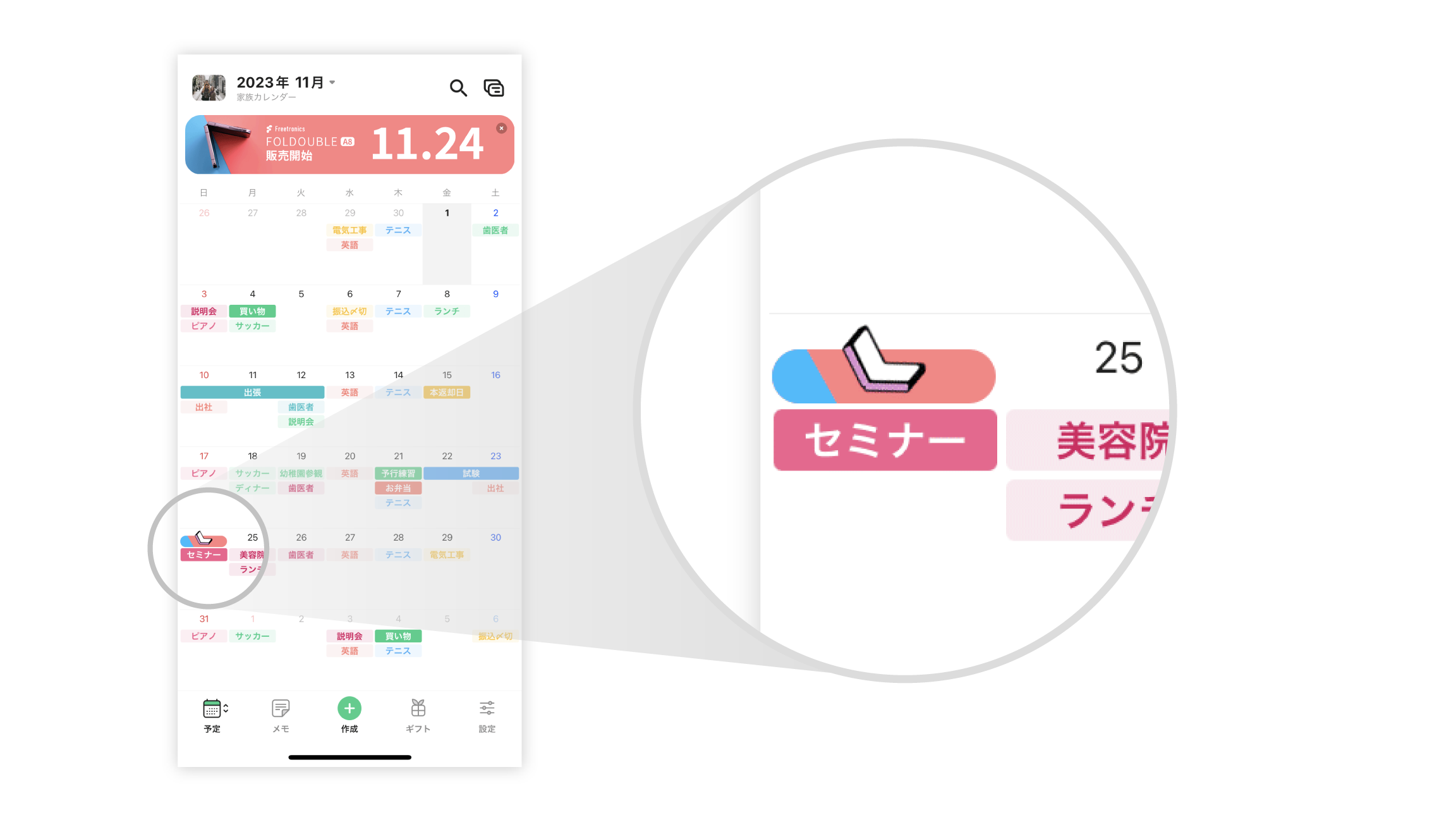 指定した日付の予定確認画面(デイリー面)下部にバナーを掲載する従来の表現と合わせて高い認知効果を実現します。