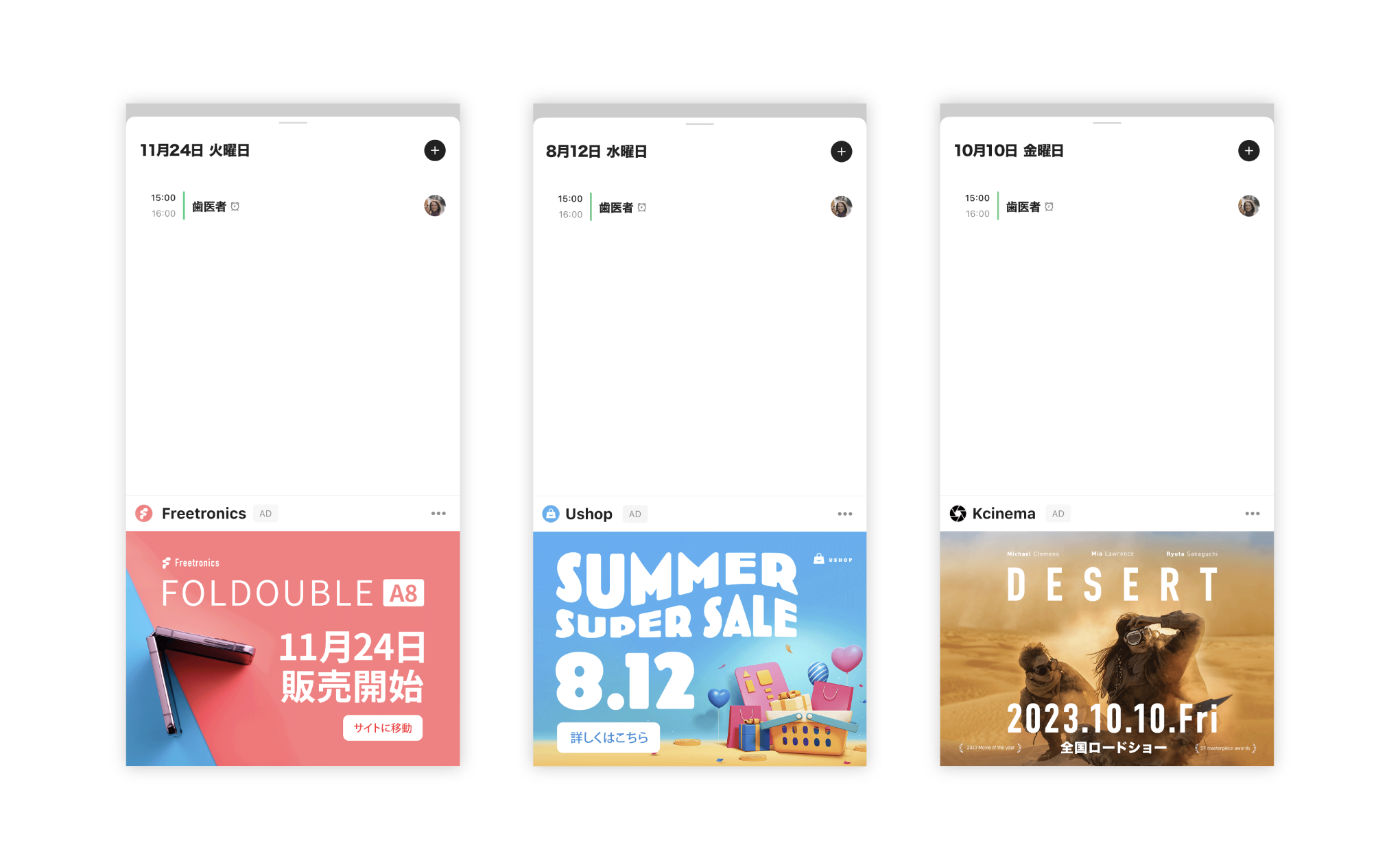 予定を確認するデイリー面では、指定した日付により大きなクリエイティブで詳細情報を掲載することができます。広告掲載期間中は、指定した日付へ独占的にバナーを掲載いただけます。