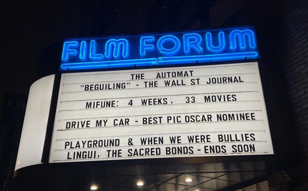 「Film Forum」は、ニューヨーク市で唯一の自律的な非営利映画館です。国立芸術基金、ニューヨーク州芸術評議会、NYC文化省を含む様々なNYC機関が公的資金を提供し、また個人、財団、企業体などの民間団体の寄付により運営されています。多様な社会的、政治的、歴史的、文化的、国際的なドキュメンタリー性と世界との関連性を重視した作品が上映されています。