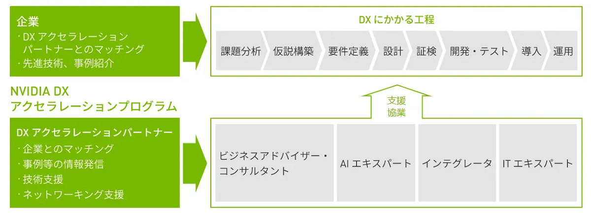 「DXアクセラレーションプログラム」は、企業のデジタルトランスフォーメーションを支援するためのプログラムで、ビジネスコンサルタントやAIエキスパート、システムインテグレータ等の「DXアクセラレーションパートナー」とNVIDIAとで構成されています。