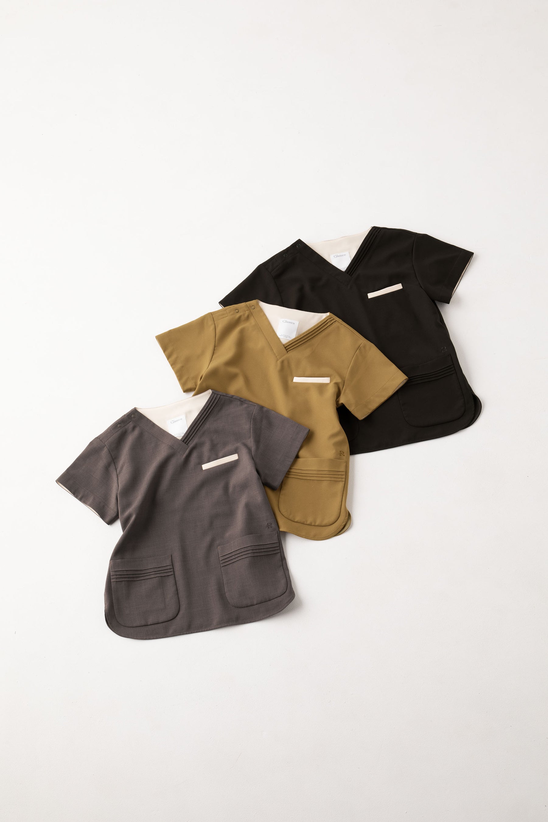 シルエットは裾に向かってフレアになるAラインに、袖丈は治療や作業時に邪魔にならないよう七分丈にする機能性も忘れません。