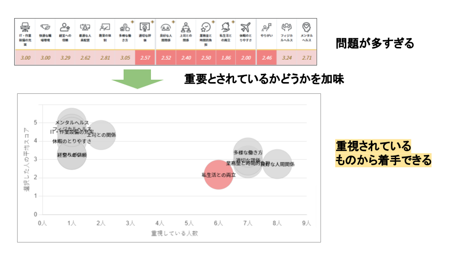 従業員の働く上での多様な価値観から、組織課題の優先度を決定できる