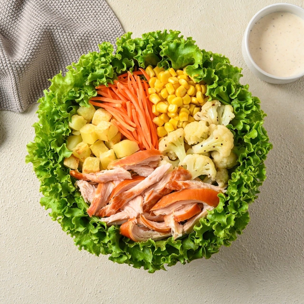 冬に甘みが強くなるじゃがいもやカリフラワー。大人気のスモークチキンと、アンチョビやチーズ香るシーザードレッシングを合わせたサラダです。