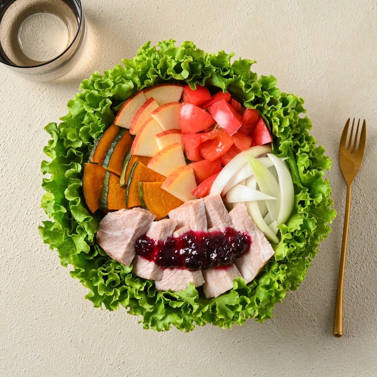 自家製ベリーソースポークと北海道産スマイルボールのサラダ