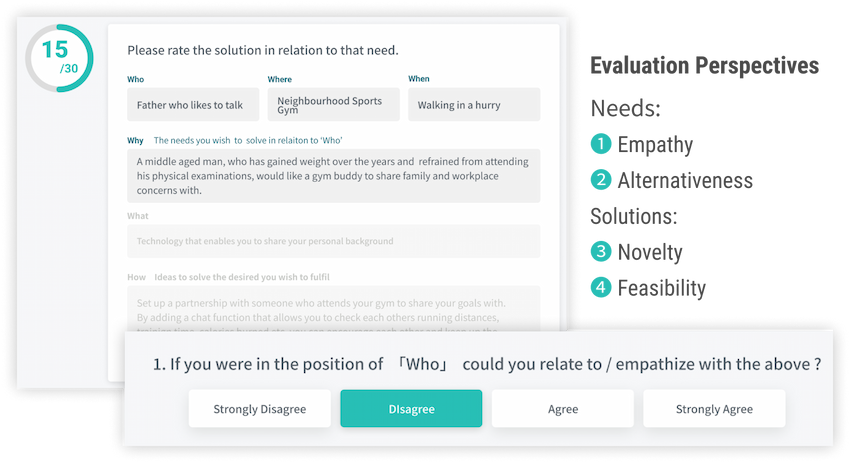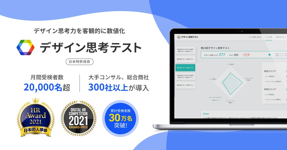 デザイン思考は、GAFAを始めとした世界の革新的企業で広く使われている事業創造アプローチです。「デザイン思考テスト」では、VISITSが開発したCI技術(日米特許取得)により、デザイン思考力(創造力や共感力など)が数値化され、デザイン思考スコア®として算出されます。2019年7月のサービス提供開始以降、大手コンサルや総合商社など300社以上で導入。主に、採用試験や人材の発掘・育成領域においてスキルを可視化するために活用されています。