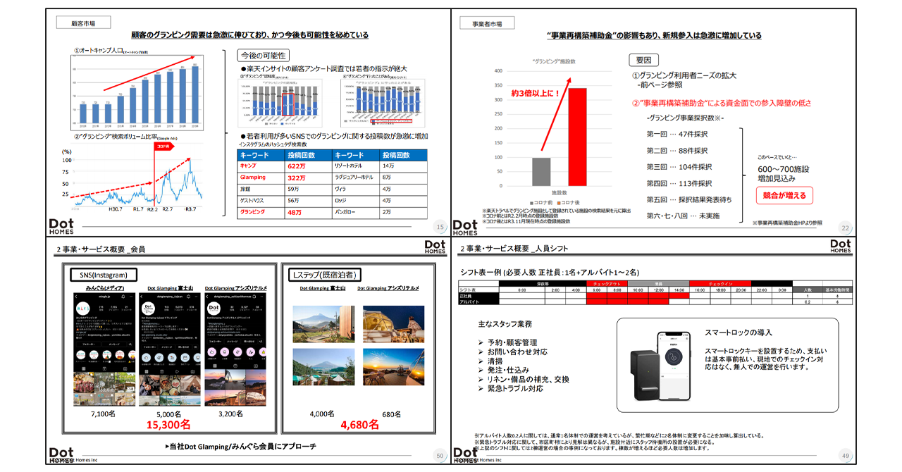 新型コロナウイルスによる三密回避や事業再構築補助金などの背景、初期費用の低さと事業回収率の早さなどから、現在、多くの事業者がグランピング市場への参入を試みており、2021年時点で、過去最多の300施設以上が開業を控えるほどの成長市場となりました。その様な中で「差別化」「集客」は事業を成功させる上での重要なファクターとなっております。「Dots」は、グランピング事業に豊富な実績を持つDot Homesのノウハウを駆使したブランドで、これらの課題解決を実現するブランドとなっております。グランピング事業への参入を検討しているものの、差別化や集客にご不安のある企業様に強くおすすめをいたします。