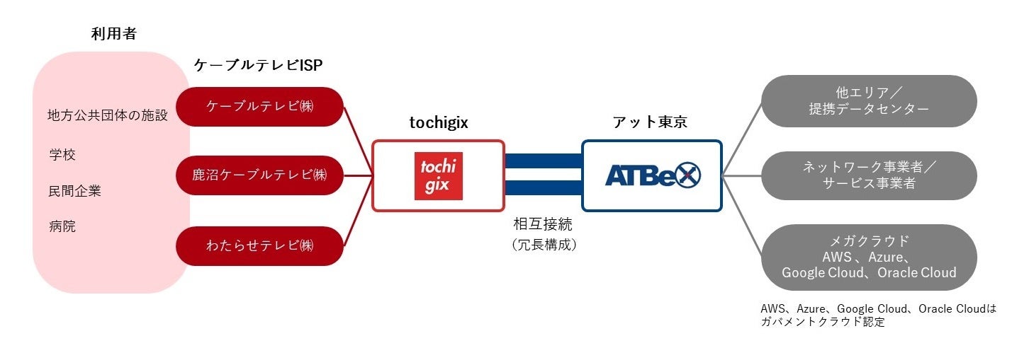 株式会社アット東京(本社:東京都江東区、代表取締役社長:泉田 達也、以下:アット東京)、ケーブルテレビ株式会社(本社:栃木県栃木市、代表取締役社長:髙田 光浩)、鹿沼ケーブルテレビ株式会社(本社:栃木県鹿沼市、代表取締役社長:田濤 広行)、わたらせテレビ株式会社(本社:栃木県足利市、代表取締役社長:相馬 稔)の4社は、アット東京のネットワークサービスプラットフォーム「ATBeX※1」と栃木県内のケーブルテレビISP(Internet Service Provider)を相互接続した地域IX※2(Internet eXchange)である「tochigix」が連携することを発表いたします。なお、連携によるサービス提供開始は2024年春を予定しており、準備が整い次第、各社のホームページなどでお知らせいたします。