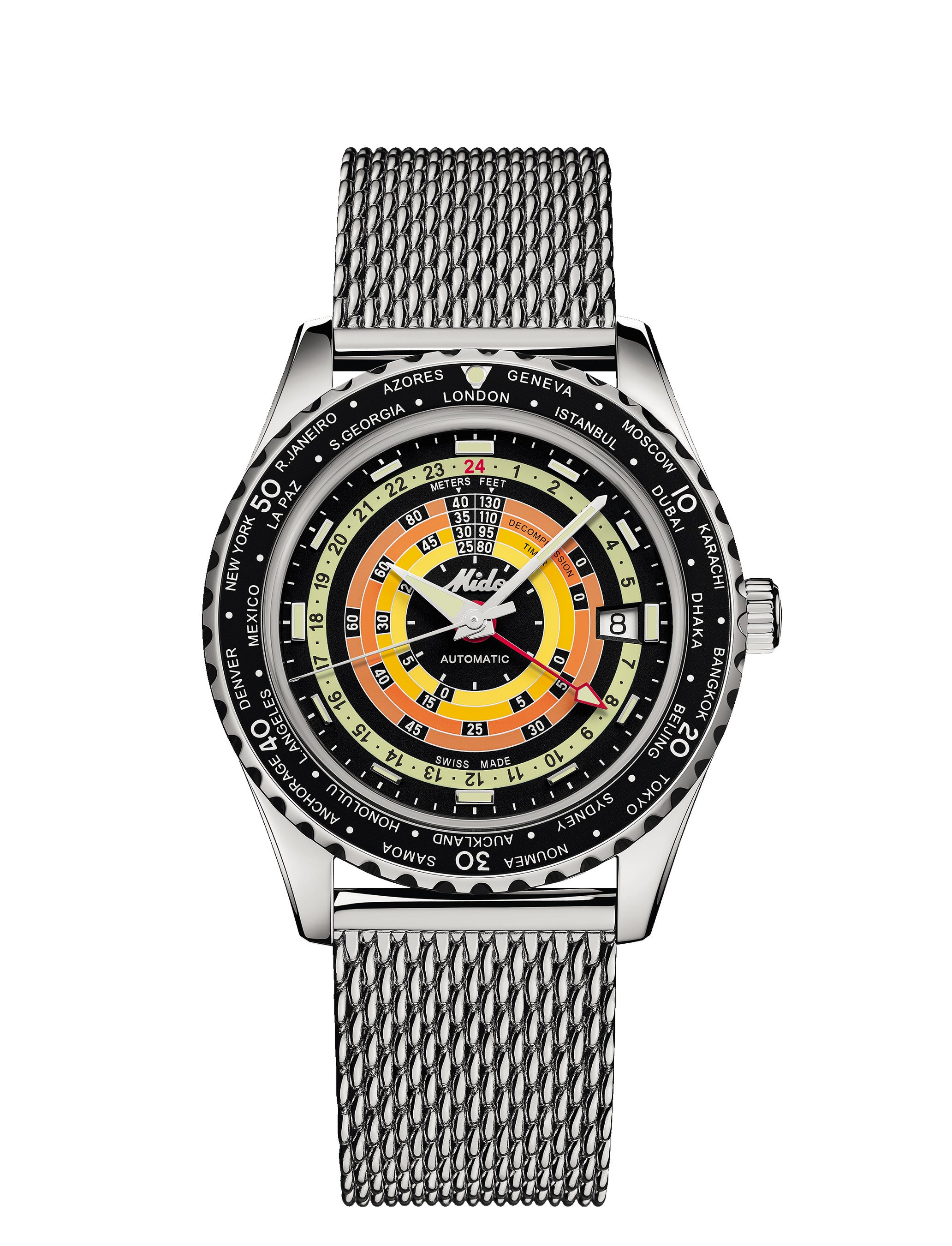新しいオーシャンスター デコンプレッション ワールドタイマーは、愛好家を新しい地平へと導きます。オリジナルスタイルの減圧テーブル、ワールドタイムを表示するベゼルを備えたGMT機能など、ミドーはこのアイコニックピースの成功を受けて、2つのスペシャルエディションでさらなる高みを目指しています