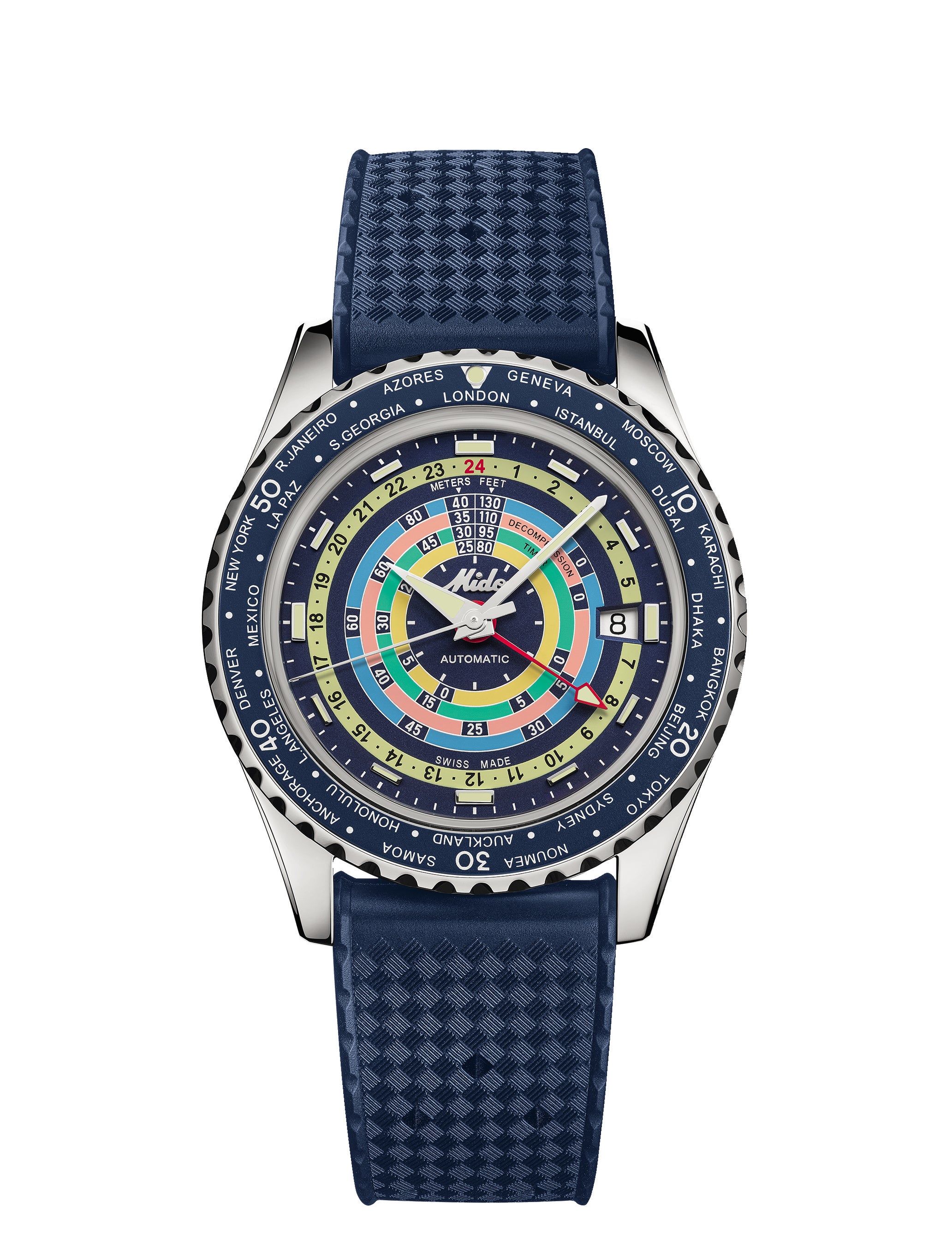 オーシャンスター デコンプレッション ワールドタイマーは、60年代のミドー伝説の成功の上に立つ現代のトラベラーをいざなう、魅力的なハイパフォーマンスピースです。