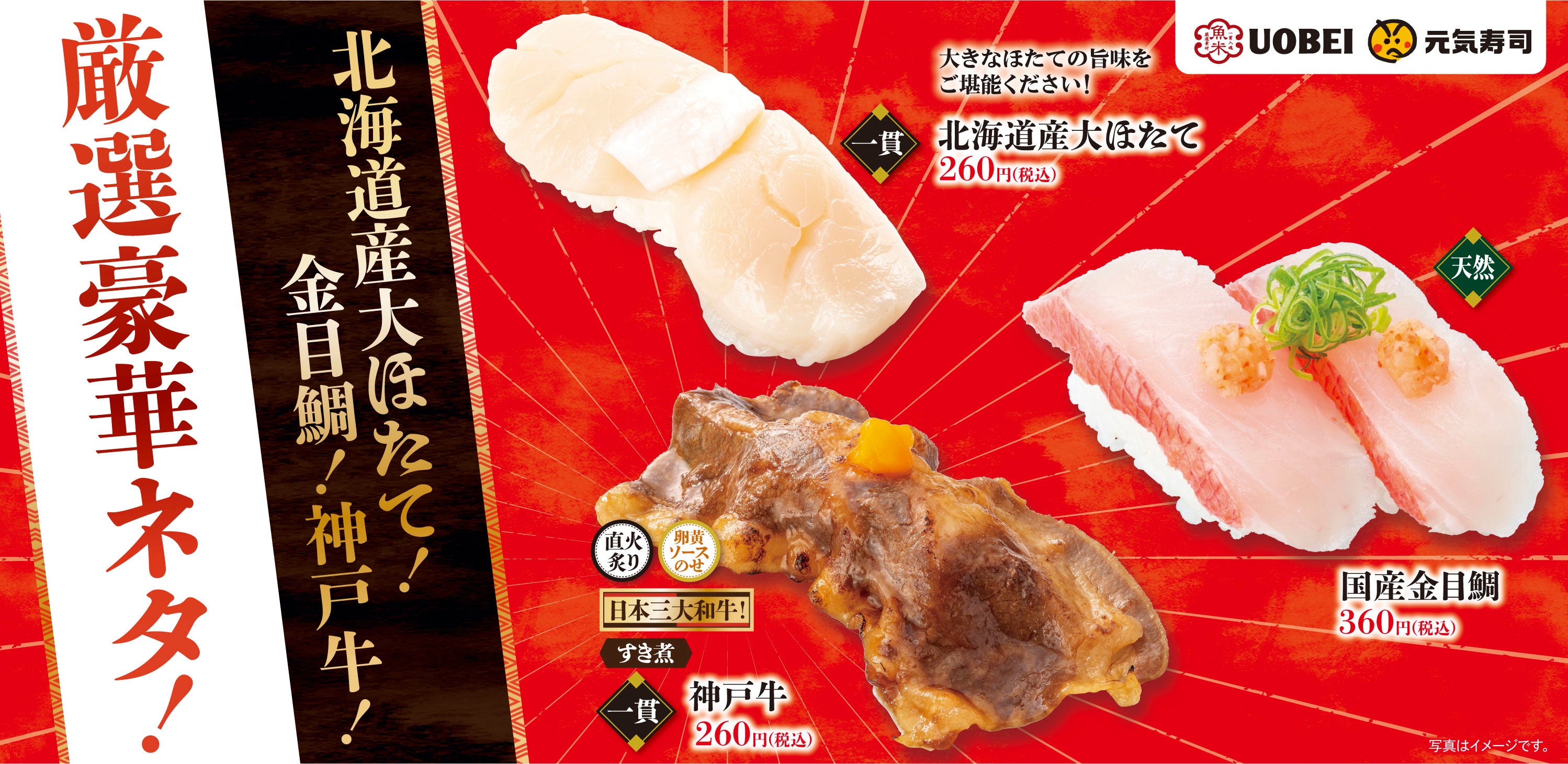 寿司レストランチェーンを展開する元気寿司株式会社(本社:栃木県宇都宮市 代表取締役社長 法師人尚史)は、12月27日(月)から期間限定で「北海道産大ほたて!金目鯛!神戸牛!厳選豪華ネタ」フェアを開催いたします。また、引き続き「冬の美味いねたづくし!」も期間限定で開催しております。