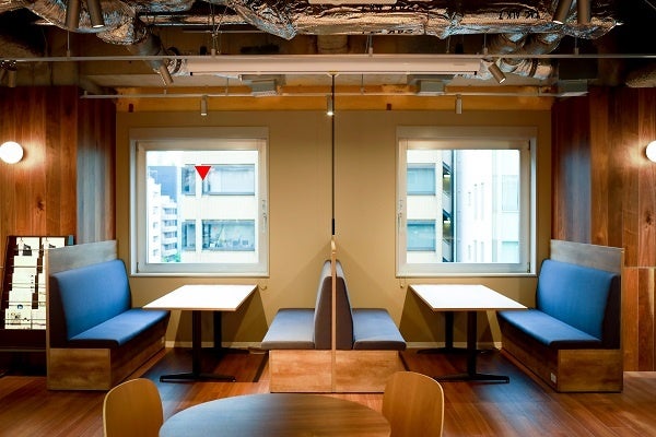 窓際で集中しやすいバーカウンター、対面でコミュニケーションしやすいファミレスシート、アイデアが生まれやすいと言われるスタンド型ミーティングテーブルやハイテーブルを設置しています。