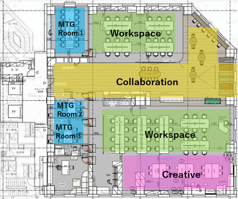 本社オフィスで働くチームはアパレルチーム、ヘルスケアチーム、インターナルチームとなり、業務内容は大きく異なります。メンバーのシナジーがアップするよう、中央に「コラボレーションゾーン」を設け、対話と交流を生み出しやすいオフィスとなっています。またワークスペースは固定席とフリーアドレスに分かれており、チームを横断してコミュニケーションが活性化されます。