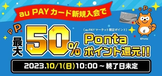 対象期間中にau PAY カード新規入会のうえ、au PAY マーケットお支払い時にau PAY カードを選択いただくと、最大3カ月間、購入金額の最大50%をPontaポイント(au PAY マーケット限定)として還元します。