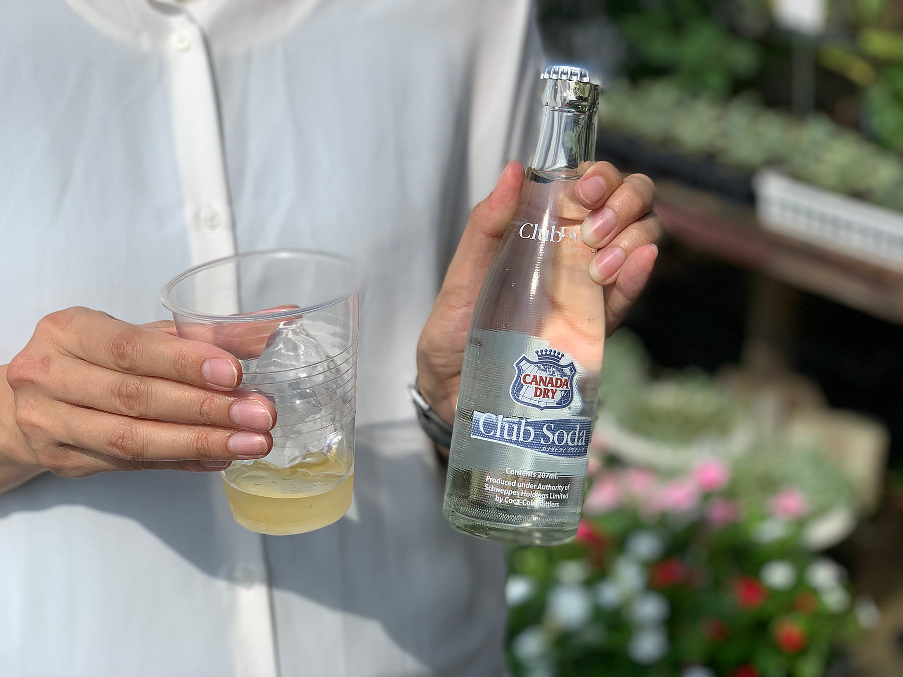 専用コイン(超ハイコイン)をスタッフに提示して氷と炭酸(カナダドライ200ml)を受け取ります。