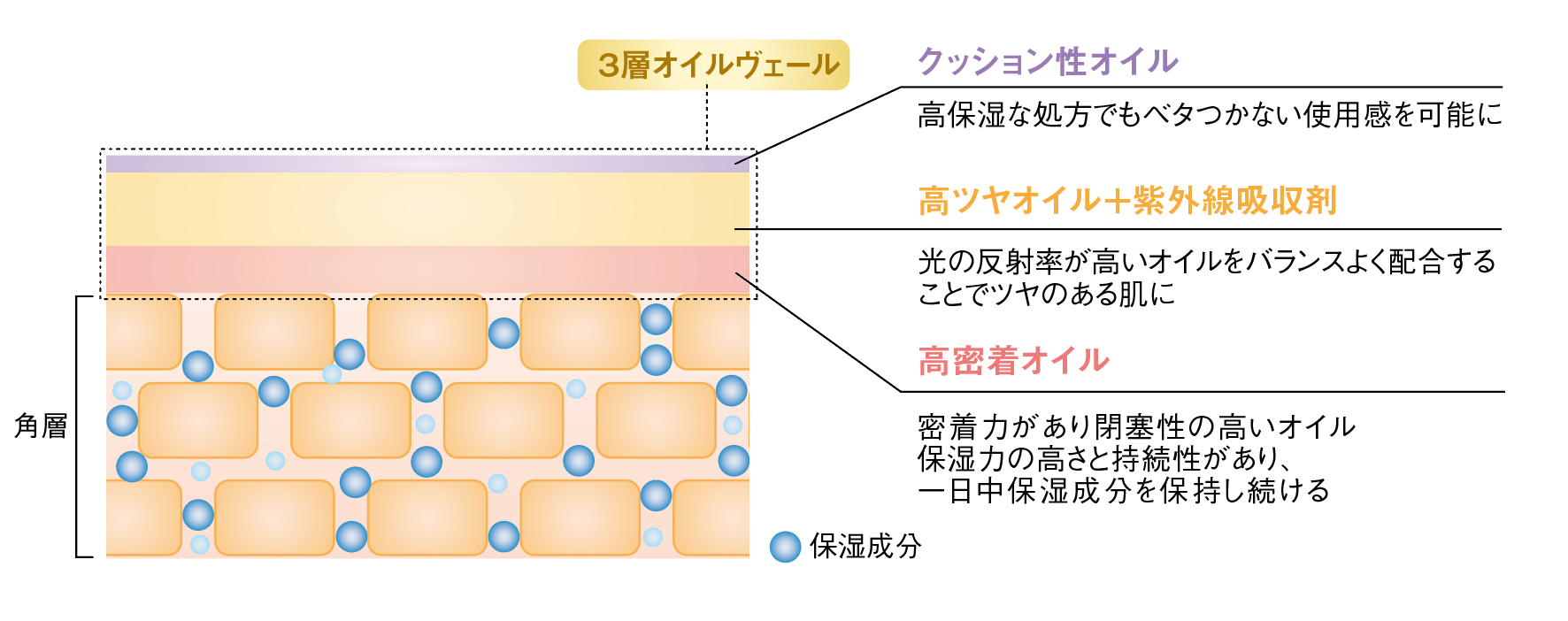 〇 独自処方「3層オイルヴェール」により、日中の肌にうるおい・ツヤ・ハリを与えます。