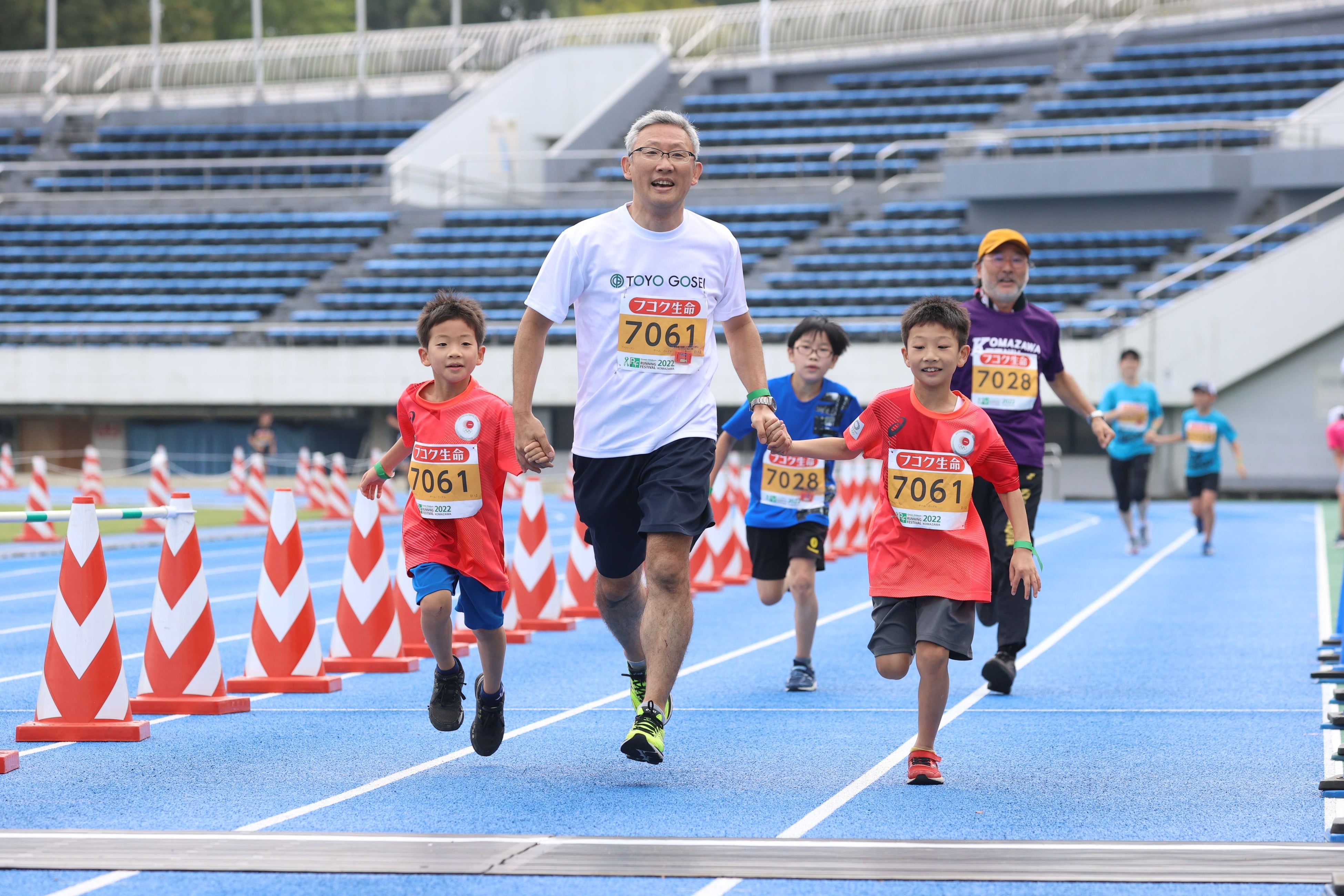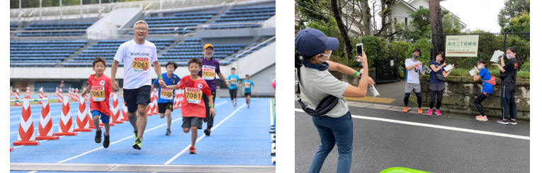 小学生以上の子と保護者からなる2~5人で1周約2.3kmのコースを一緒に走るファミリーランは、一緒に手を繋いでゴールします。