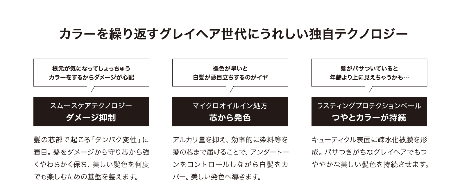 ラスティングプロテクションベールがキューティクル表面に疎水化被膜を形成し、パサつきがちなグレイヘアでもつややかな美しい髪色を持続させます。