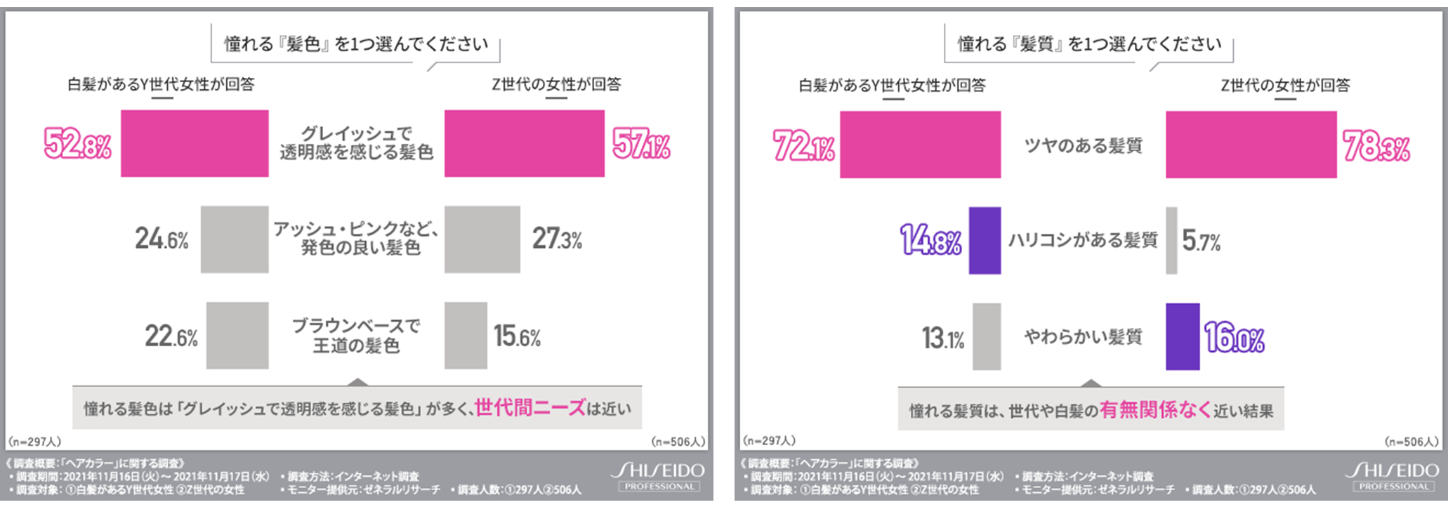どちらの世代も透明感を感じるグレイッシュカラーが人気を集めており、髪色のニーズについてはともに近しいという結果となりました。