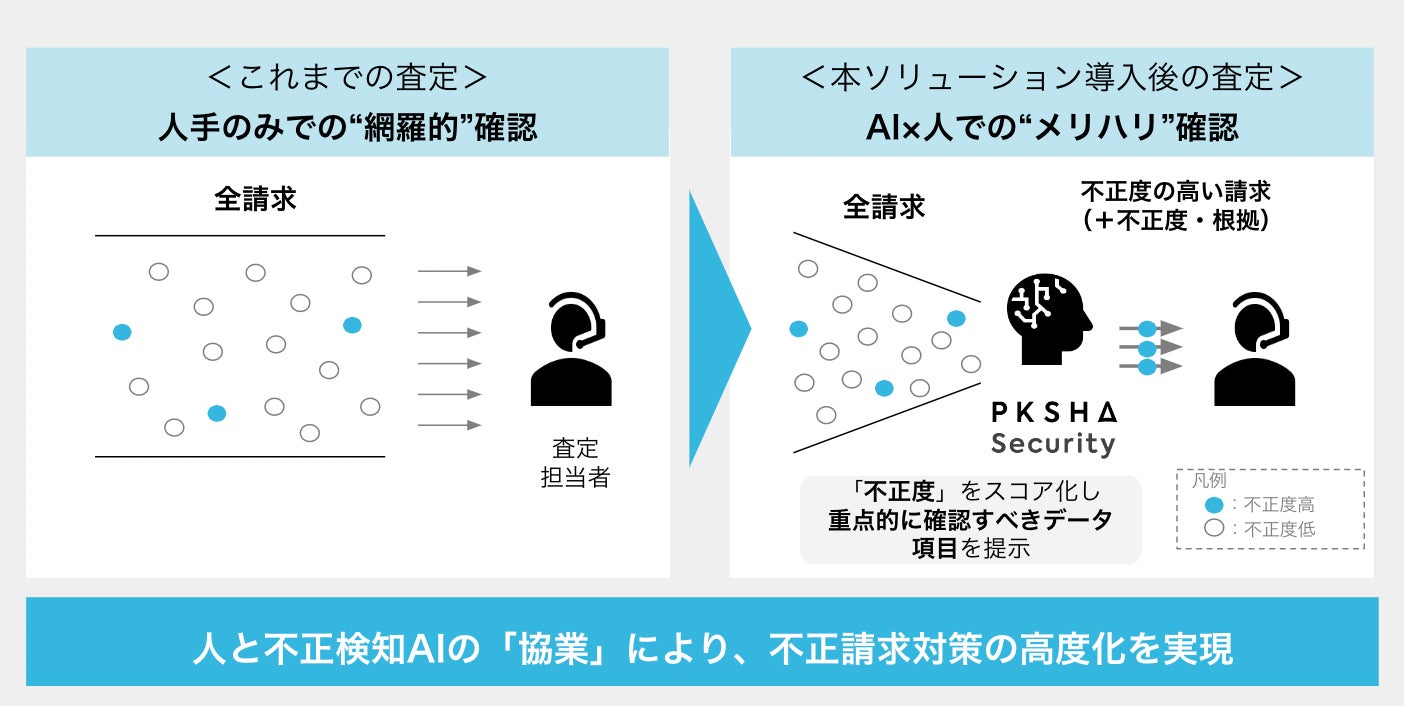 株式会社PKSHA Technology(本社:東京都文京区、代表取締役:上野山 勝也、以下PKSHA)は、東京海上ホールディングス株式会社との合弁会社である株式会社AlgoNaut(代表取締役:佐野 長紀)と連携し、日新火災海上保険株式会社(本社:東京都千代田区、 取締役社長:織山 晋、以下日新火災)の自動車保険金の不正請求対策に、PKSHAの予測最適化技術および自然言語処理技術等を活用したアルゴリズム「PKSHA Security for Insurance」を2022年8月から提供開始したことをお知らせいたします。PKSHAグループは「人とソフトウエアの共進化」というビジョンのもと、ソフトウエアを通じ、日本の経済活動の新たな形の実現を目指しています。本案件では、自動車保険における不正請求パターンを認識・スクリーニングし、不正検知根拠となるデータを可視化する事により、不正が疑われる請求について事故対応業務に携わる「人」と「ソフトウエア」の協業ができる仕組みを構築しました。