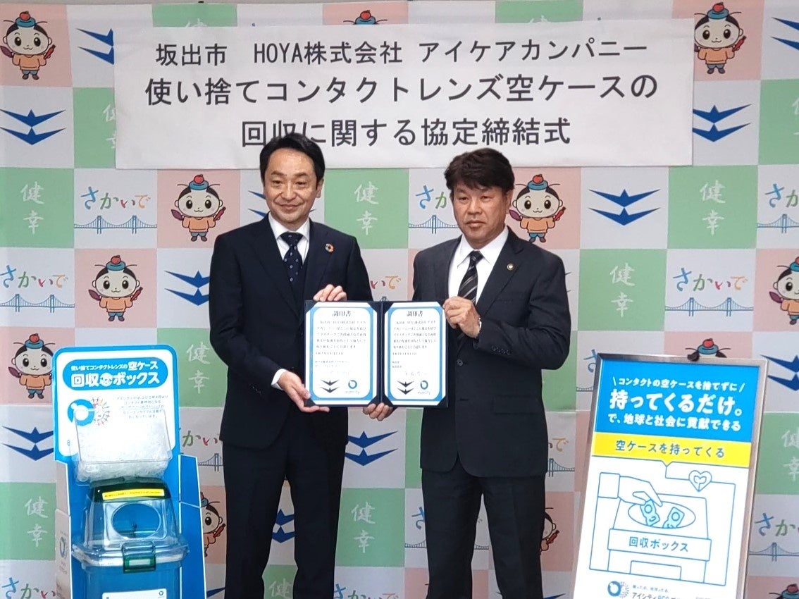 この協定内容は、当社が行う、使い捨てコンタクトレンズ空ケース回収の取り組みについて、香川県坂出市が情報発信・回収活動を行い、市民の皆さんに広くプラスチックごみ削減と資源再生の意識を啓発していくというものです。世界で広がっているSDGs社会の実現への取り組みに、当社が少しでも貢献できるよう、これからも「アイシティ ecoプロジェクト」を推進していきます。