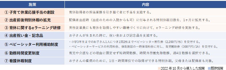 GOOD PLACEでは、従業員のライフスタイルに合わせた多様な働き方を実現するために、以前からさまざまな育児支援をおこなってきました。2022年4月に改正育児・介護休業法が施行されたことを受け、さらなる育児支援制度の充実と男性従業員の育休取得促進を図るために導入した新たな3つの制度ほか、出産祝金・記念品の支給や、ベビーシッター利用補助制度、勤務時間変更制度などを導入し、出生直後の一時的なものではなくお子さまが大きくなってからも持続的に支援することで、従業員の仕事と家庭・育児両立のサポートにつとめてまいりました。