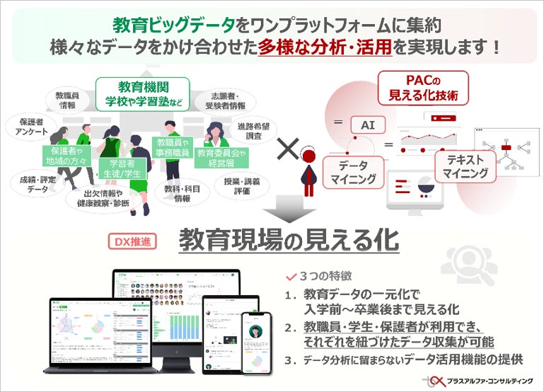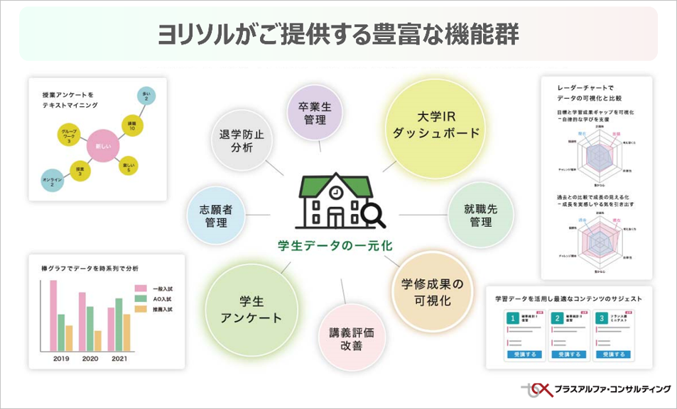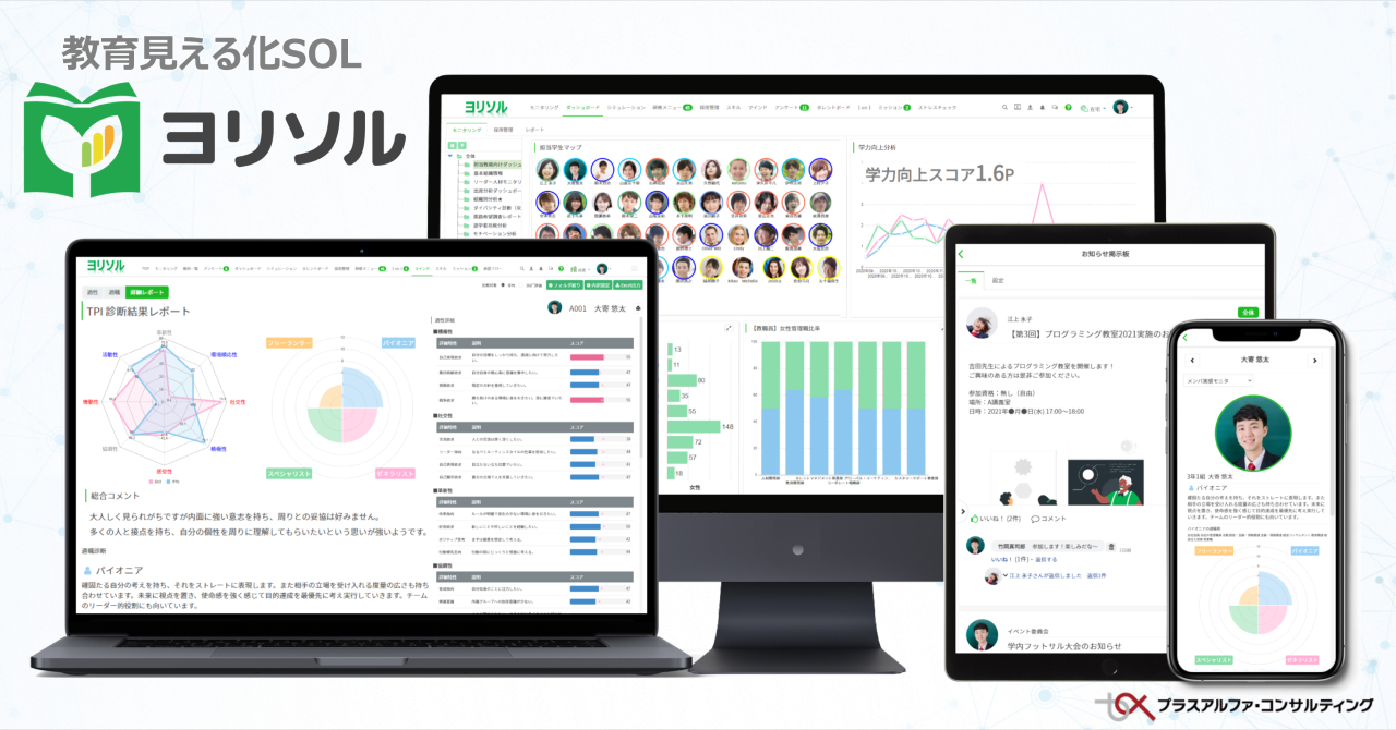 株式会社プラスアルファ・コンサルティング(本社:東京都港区、代表取締役社長:三室克哉)は教育現場のデータの管理・活用を支援する、スクールマネジメントシステム 「ヨリソル」 のβ版を2022年5月に提供開始しました。「ヨリソル」では、大学IRを支援するための学生データ分析機能(ファクトブック作成支援)、学修成果の可視化機能、学生アンケート機能等を提供します。