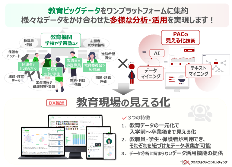 株式会社プラスアルファ・コンサルティング(https://www.pa-consul.co.jp/)は『あらゆる情報から付加価値を生み出し続ける、見える化プラットフォーム企業』として、2006年の設立以来、顧客の声や顧客データ/購買データ、人事情報のようなビッグデータを「見える化」し気づきを与える力を持つ、「テキストマイニング」や「データマイニング」などの技術を核としたクラウドソリューション事業を行っています。様々な情報を「見える化」することで、お客様のビジネスに+α(プラスアルファ)の価値を創造するためのソフトウェアの開発・販売、コンサルティング、新規事業創出を行っています。