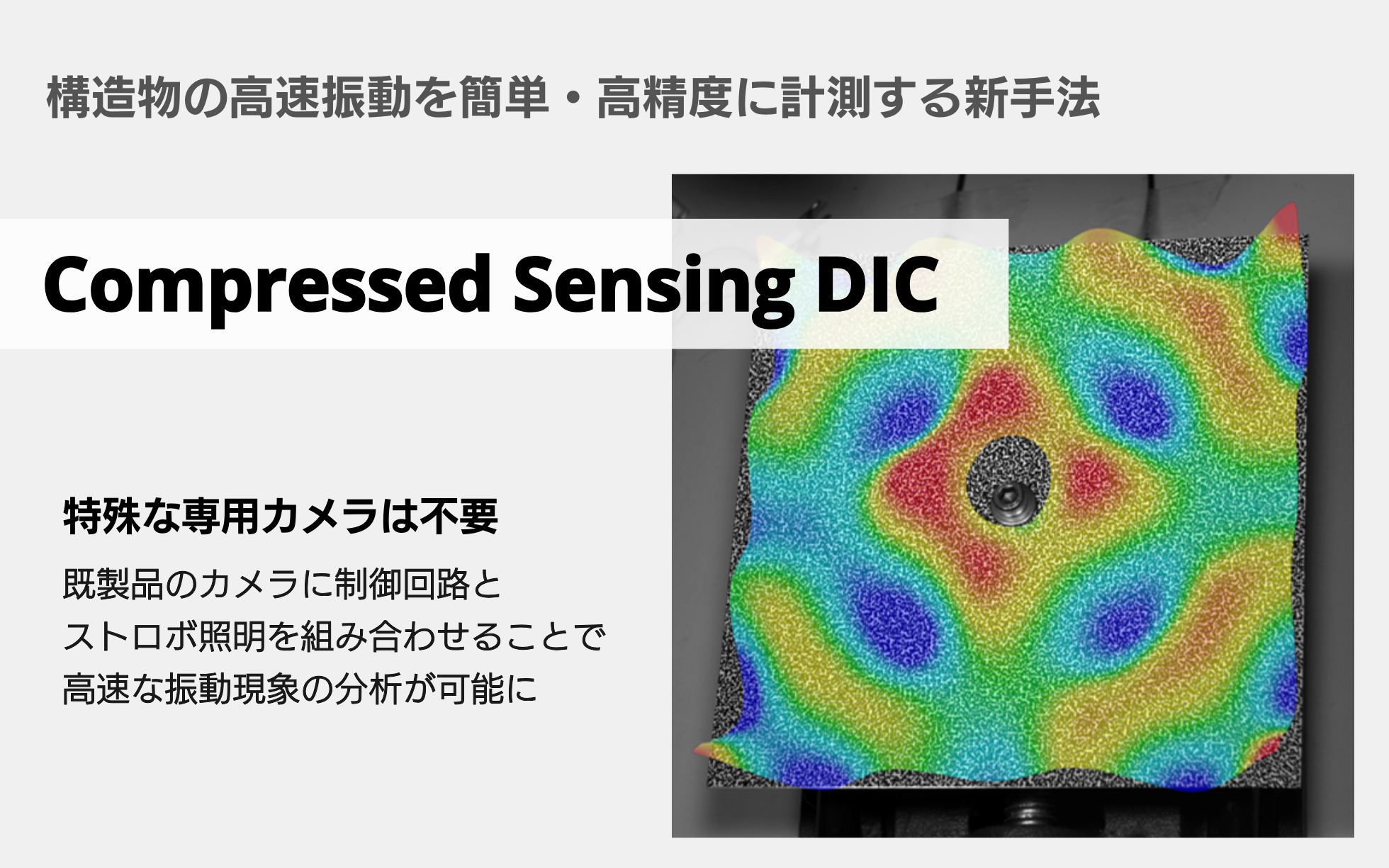 この技術と既存のDIC技術を組み合わせることで、低速度の撮影画像から高速度の情報を復元するCompressed Sensing DIC技術を開発し、低速度カメラを用いた高速現象の振動計測を実現することに成功しました。これにより、従来の課題であった解像度と撮影速度のトレードオフを解消し、高解像度かつ高速な画像振動計測が可能になります。