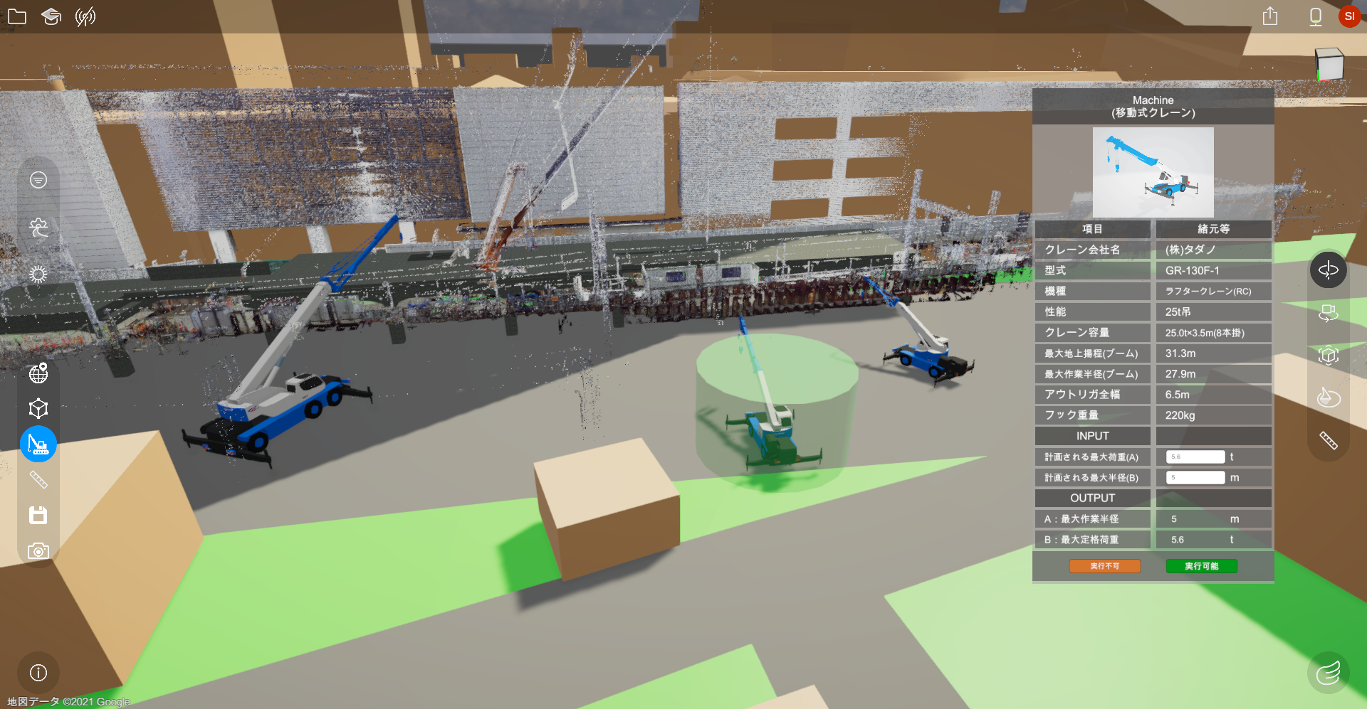 - 重機データ (クレーンなど) 追加配置、可動半径などの入力、計算機能
