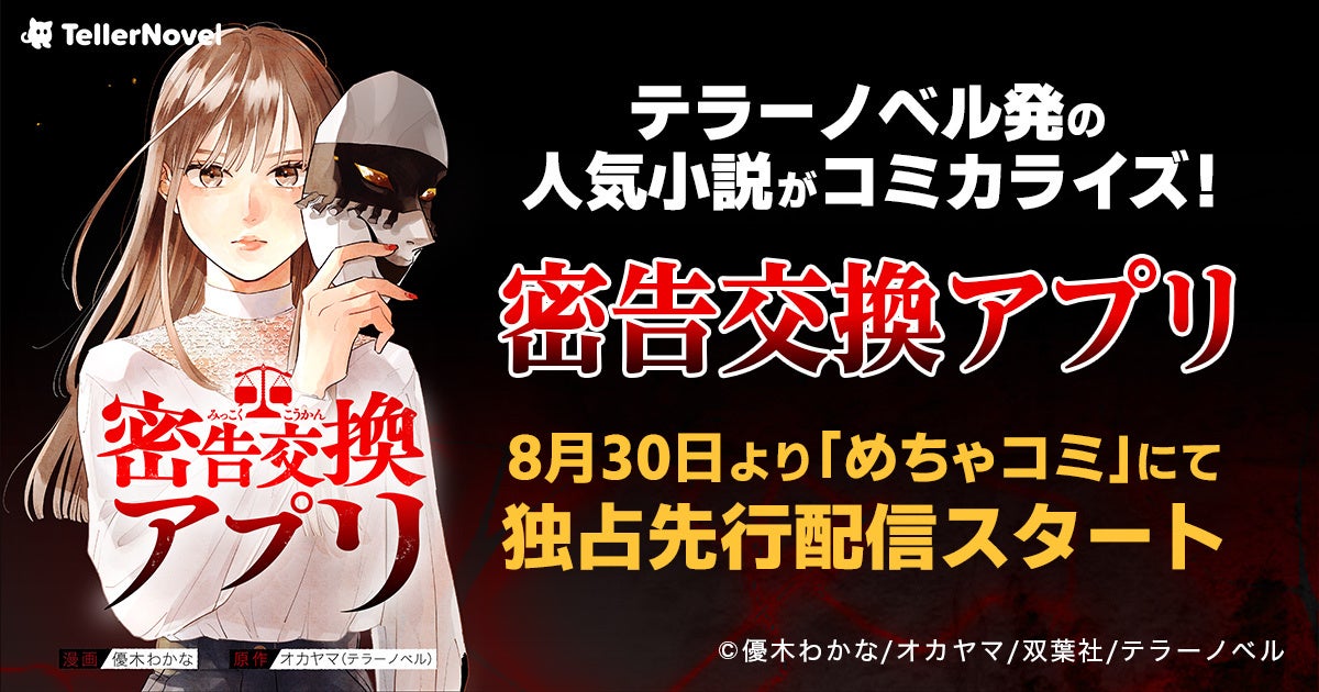 株式会社テラーノベル(本社:東京都港区、代表取締役社長:蜂谷宣人)はこの度、累計DL数760万(※)の小説共有プラットフォーム「テラーノベル( https://teller.jp/ )」発の人気小説『密告交換アプリ』がコミカライズされ、8月30日よりめちゃコミックにて独占先行配信を開始することをお知らせいたします。