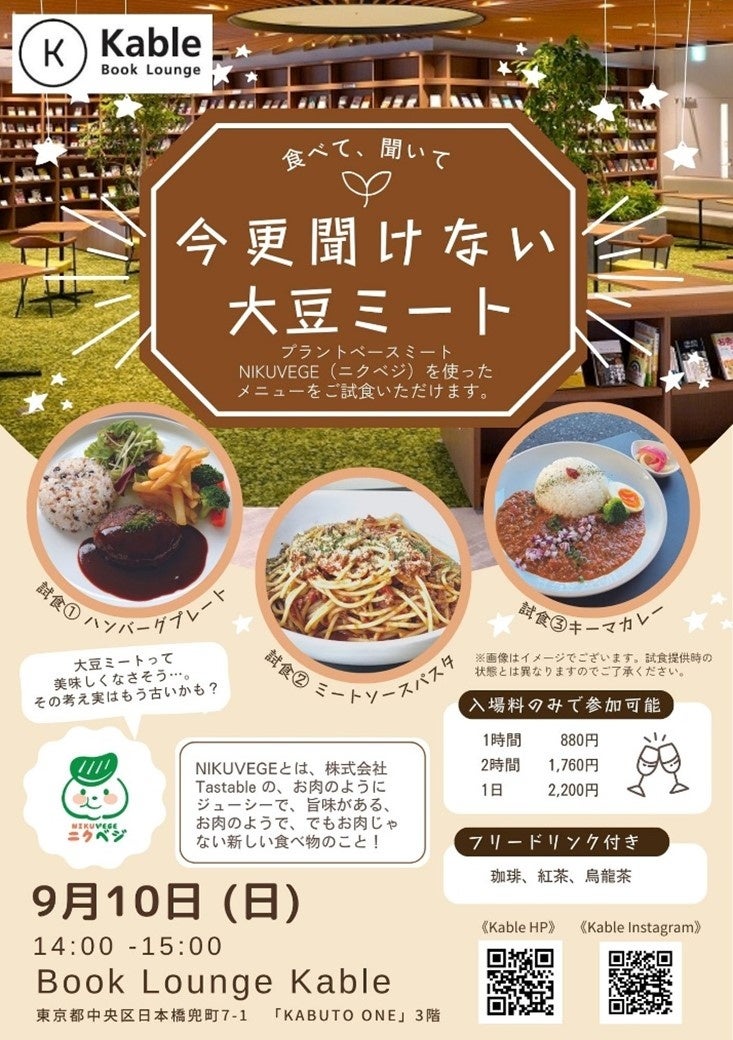 当日は、NIKUVEGEを使ったハンバーグ、ミートソースパスタ、キーマカレーの3品の試食メニューが提供され、会場参加者が自身の好みに合ったメニューを投票いただきます。その投票結果によって選ばれた上位2品を、期間限定メニューとしてBook Lounge Kableでご提供いたします。