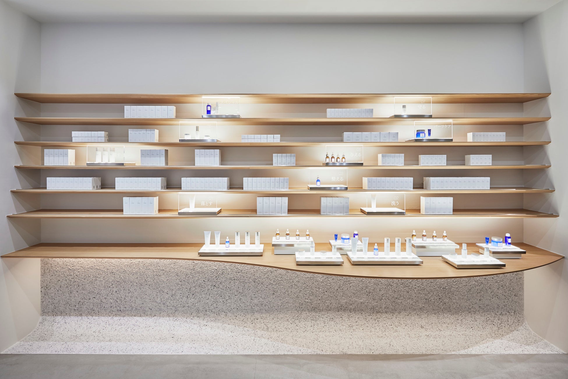 「TAKAMI GINZA」 は、河原氏のデザイン監修により2019年12月にOPENしたタカミ初の路面店です。「美しい肌は美しい角質からつくられる」と考える、タカミの“角質”へのこだわりが詰まった体験型コンセプトショップは、代表製品である角質美容水「タカミスキンピール」をはじめとしたスキンケアライン、リップ、ボディなどのパーツケア、サプリメントまでのタカミ全製品を体感できる店舗です。毎日角質をていねいに慈しむことで、いつからでもワンランク上の輝く肌に出会えることを感じていただける場所です。