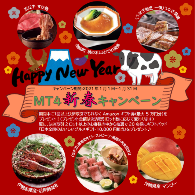 外為ファイネスト株式会社(本社:東京都千代田区、代表取締役:石野由美子)は、2021年1月1日よりMT4のお取引条件達成でもれなくAmazonギフト券、更に決済取引2ロット以上のお客様の中から抽選で20名様にGiftPadの「日本全国のおいしいグルメギフト10,000円相当」をプレゼントするキャンペーンを実施中です。