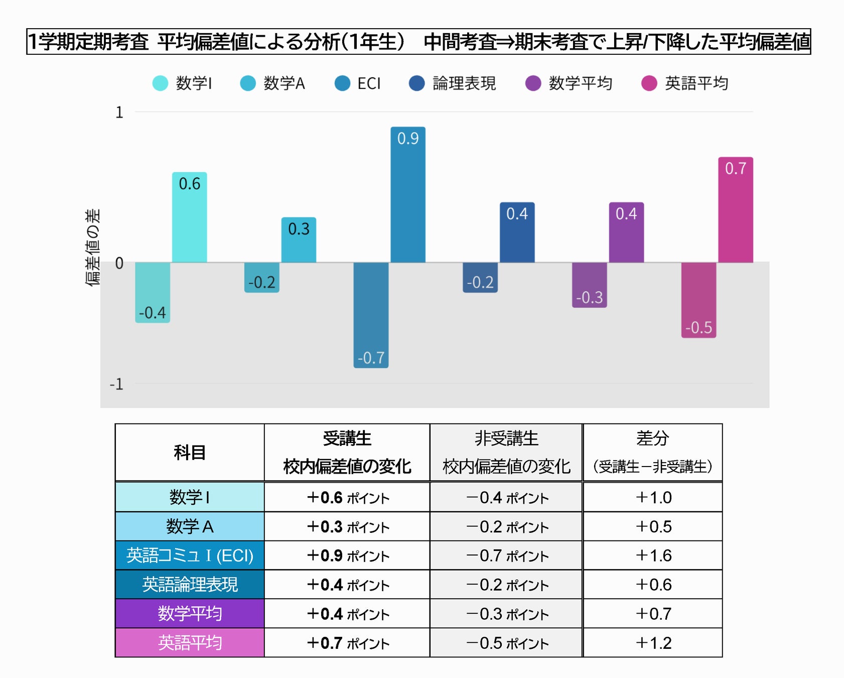 平均値で見ても、数学平均の偏差値は受講生+0.4ポイント、非受講生-0.3ポイントで差0.7ポイント、英語平均では受講生+0.7ポイント、非受講生-0.5ポイントで差1.2ポイントと、受講生は両教科で成績の維持・向上が確認されます。