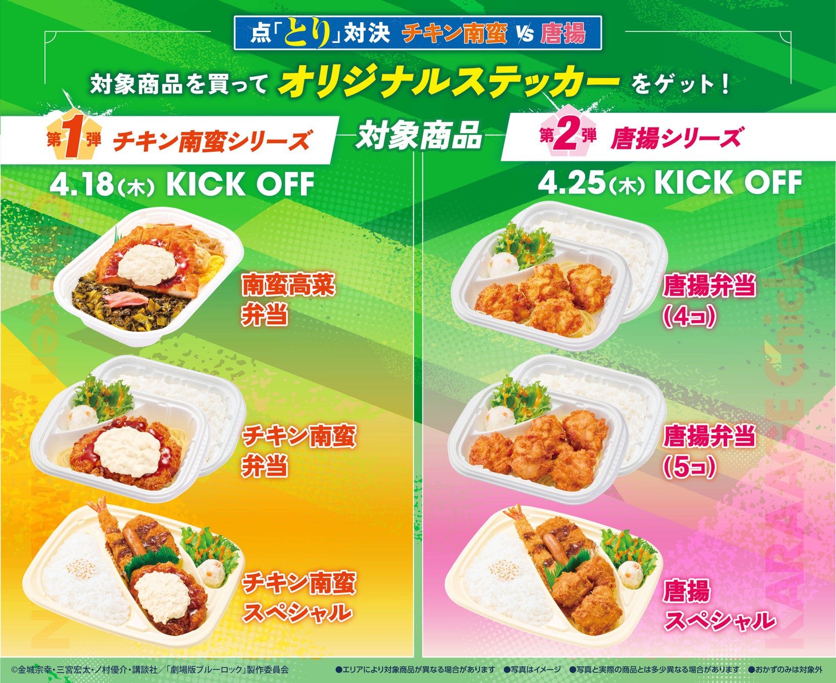 第1弾「チキン南蛮シリーズ」を1品お買い上げで、オリジナル描きおろしダイカットステッカー1枚をプレゼント。※3 キャラクターは、凪 誠士郎 ・ 潔 世一 ・ 蜂楽 廻の3人。それぞれが、チキン南蛮シリーズ(南蛮高菜弁当・チキン南蛮弁当・チキン南蛮スペシャル)をおいしそうに食べています。