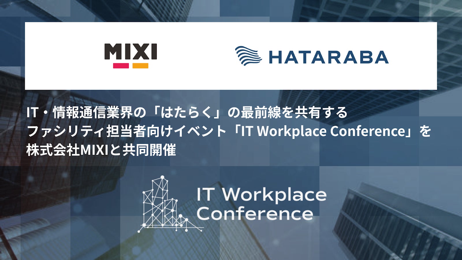オフィス移転コンサルティング・オフィス仲介サービスを提供する株式会社HATARABA(本社:東京都渋谷区、代表取締役:森村泰明、以下「HATARABA」)は、IT・情報通信業界のファシリティ・総務担当者を対象としたイベント『IT Workplace Conference』を株式会社MIXI(東京都渋谷区、代表取締役社長 上級執行役員 CEO:木村 弘毅、以下「MIXI」)と共同開催いたします。