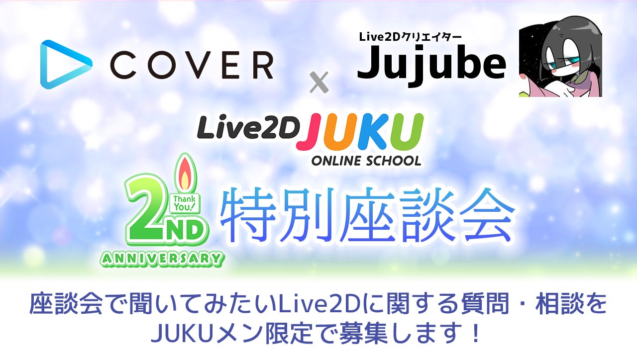 Live2D公式オンライン講座『Live2D JUKU』は8月に迎える開設2周年を記念し、カバー株式会社や個人クリエイターとのコラボなど、さまざまな企画を予定しています。