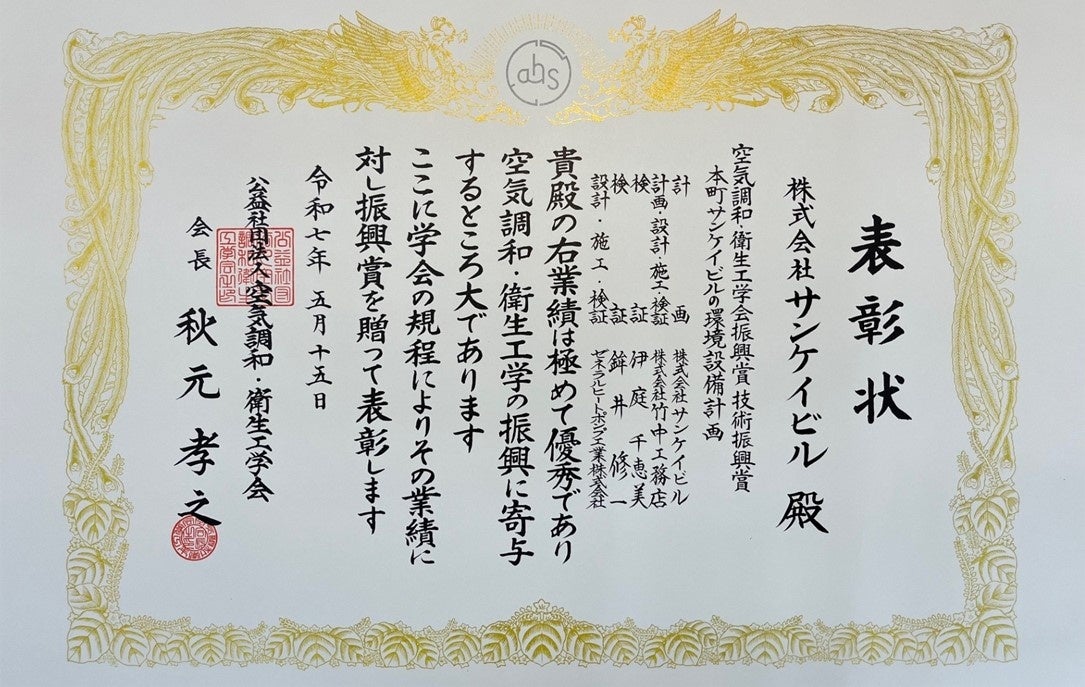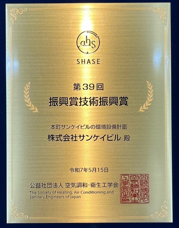 株式会社サンケイビル(本社:東京都千代田区大手町、代表取締役社長:飯島 一暢)は、「本町サンケイビル」(所在地:大阪府大阪市中央区本町四丁目3番9号)において、公益社団法人空気調和・衛生工学会 第39回振興賞 技術振興賞を受賞したことをお知らせいたします。